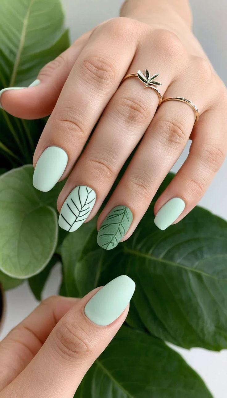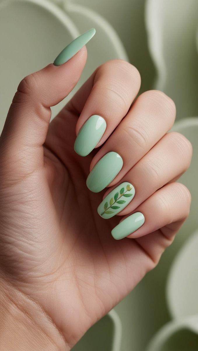 Smooth mint green nails are paired with a delicate leaf design on one accent nail for a nature-inspired finish. The overall look is fresh, organic, and perfectly suited for spring.