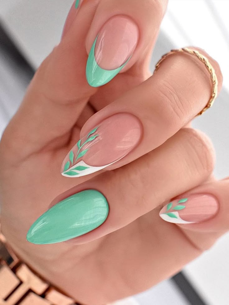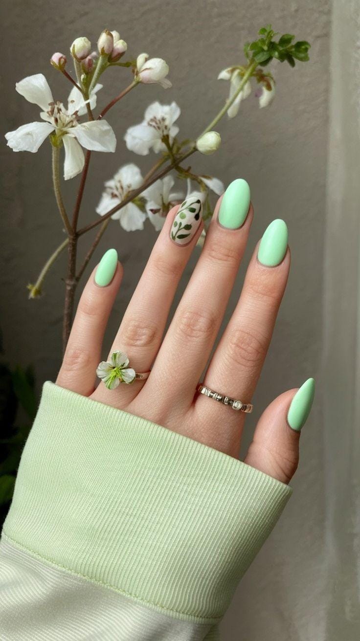 Bright mint green nails are paired with a single leafy accent nail for a playful botanical touch. The design feels youthful, fresh, and perfect for embracing spring’s natural energy.