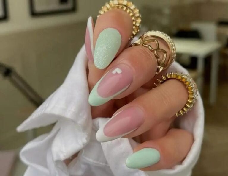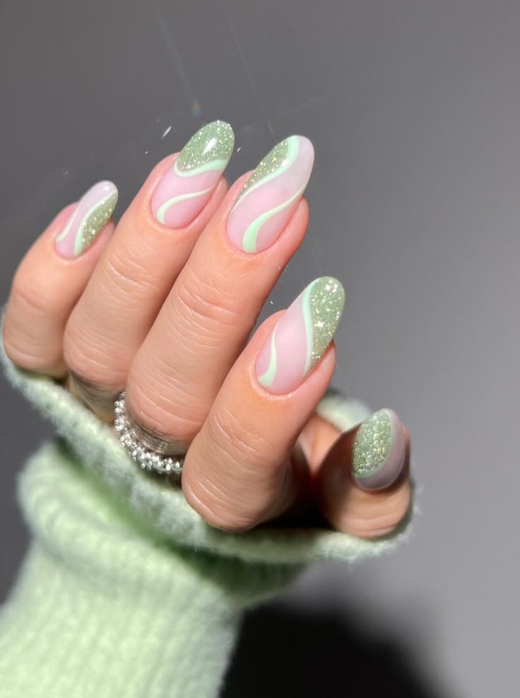 This design mixes soft mint green with sheer pink bases and flowing white swirls, finished with subtle shimmer accents. The overall vibe is elegant, airy, and slightly playful with a modern spring feel.