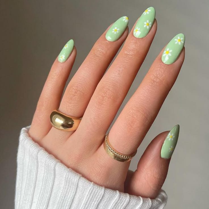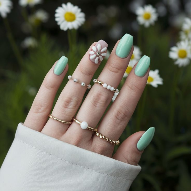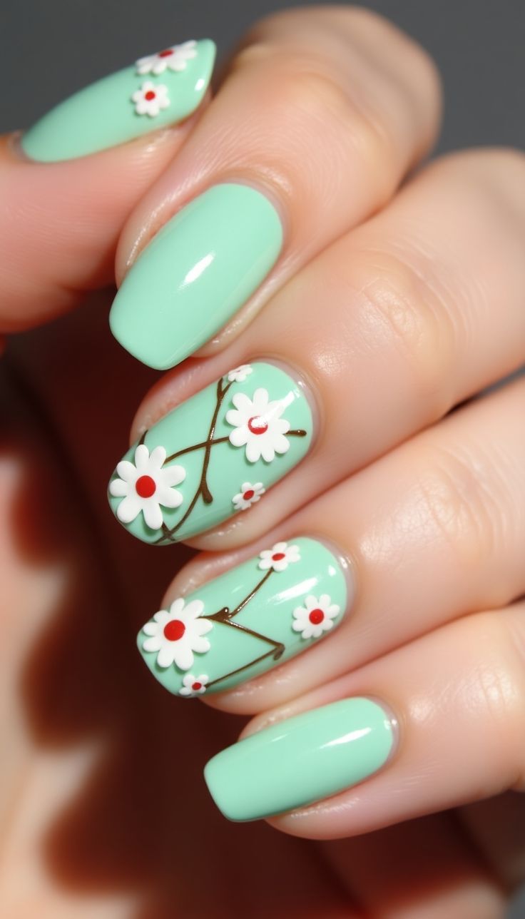 Soft mint green nails are paired with white daisy florals for a fresh, cheerful spring look. The design feels playful, light, and inspired by blooming gardens.