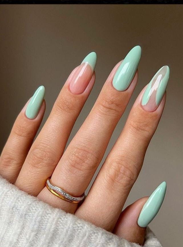 A modern take on the French manicure combines mint green tips with soft nude and full mint nails. The result is playful yet refined, capturing a bright and stylish spring vibe.