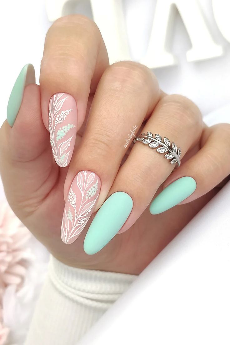 Soft mint green nails are paired with blush-toned accent nails featuring delicate white botanical line art. The look is graceful, romantic, and inspired by spring florals.