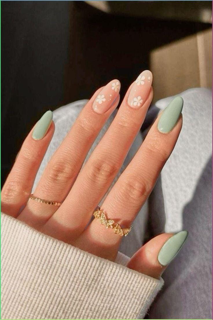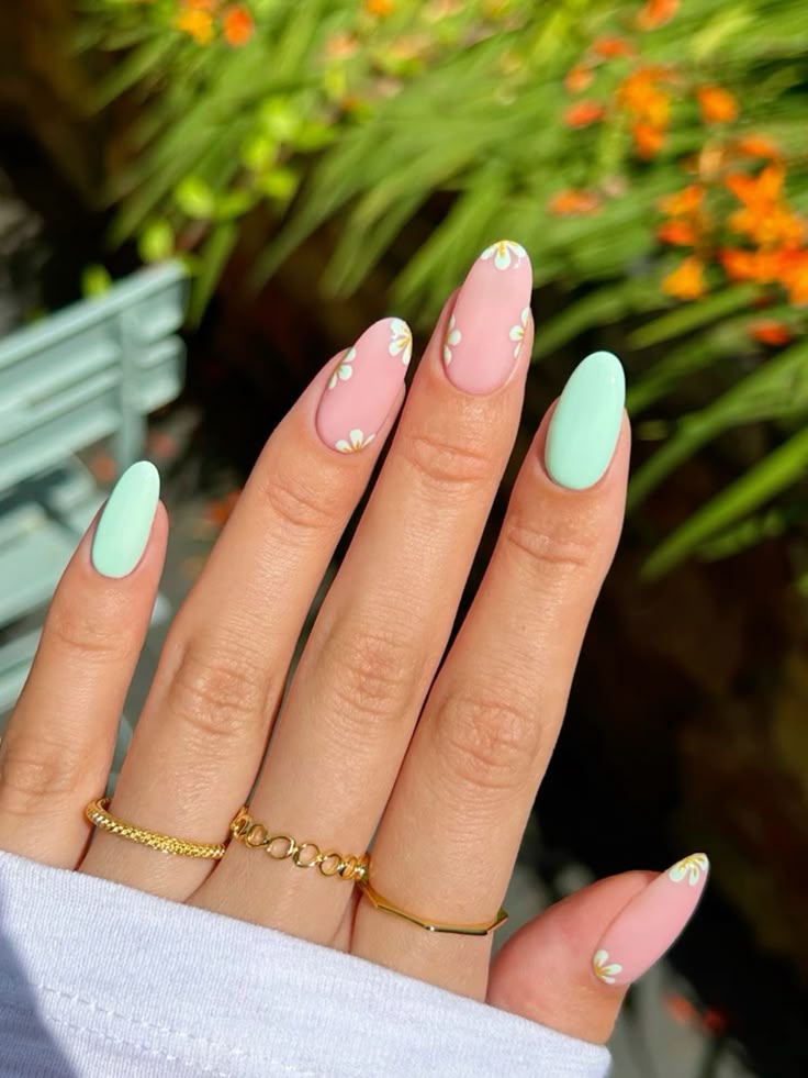 A sheer nude base meets mint green French tips and solid nails accented with tiny white daisies for a playful floral touch. This design feels light, cheerful, and unmistakably spring-inspired.