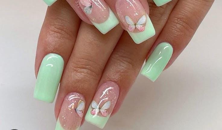 Mint green French tips are paired with soft pink bases and delicate butterfly accents. The overall vibe is whimsical, feminine, and perfect for springtime.