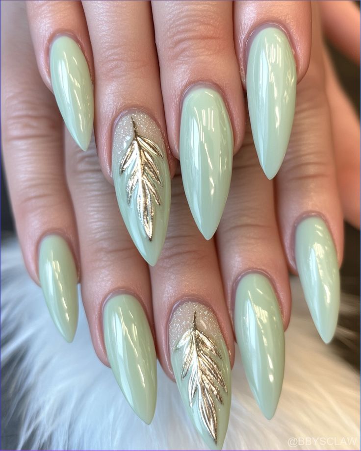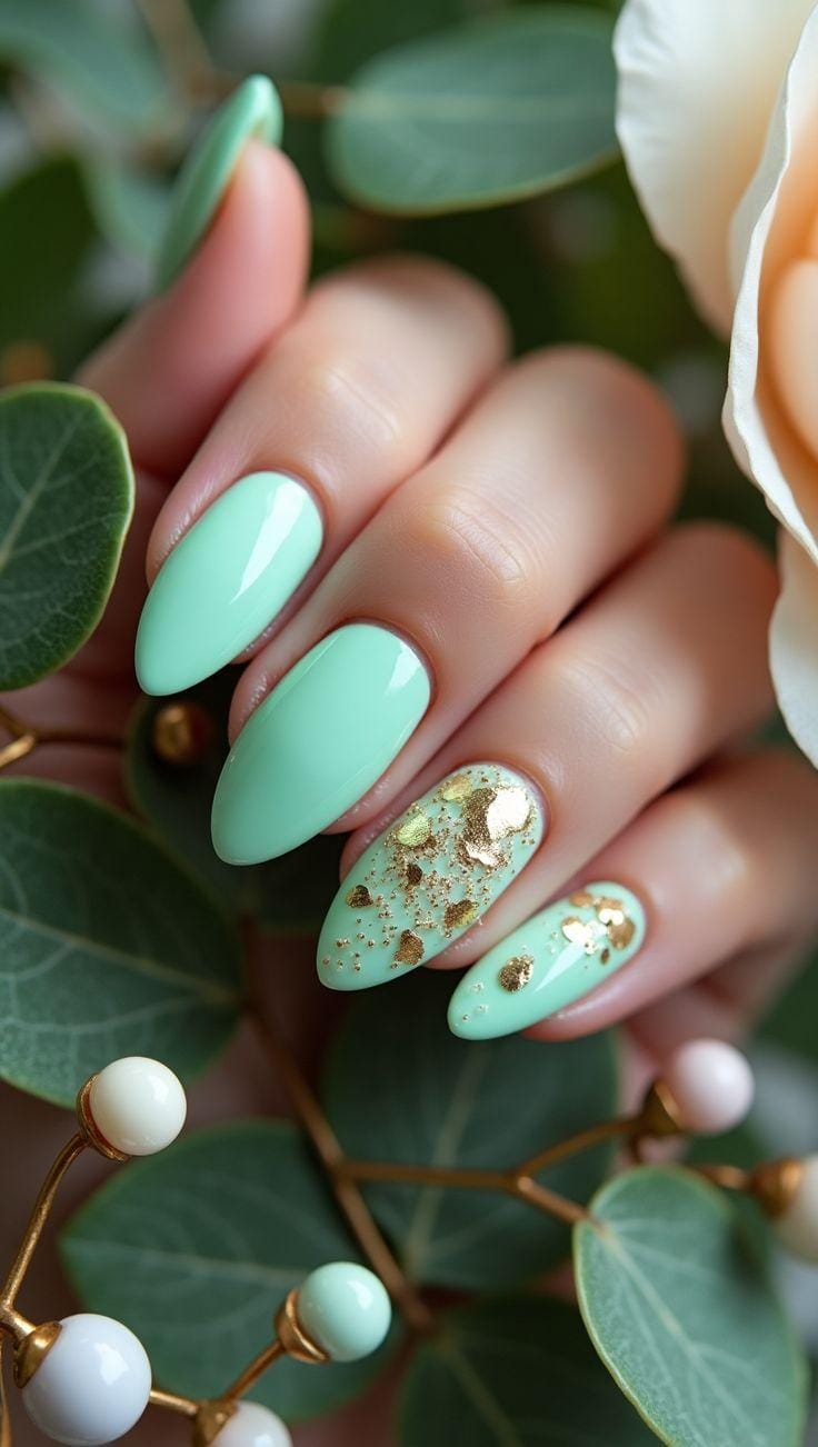 A smooth mint base is combined with metallic leaf details for a refined, elegant finish. The design feels fresh yet luxurious, perfect for spring with a hint of glam.