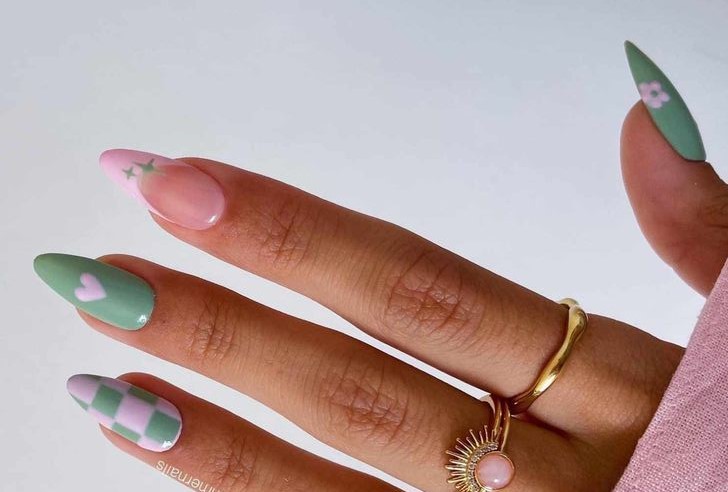 Soft mint green nails are paired with playful accents like checker patterns, tiny hearts, and subtle florals. The overall vibe feels youthful, cozy, and perfect for a cheerful spring look.