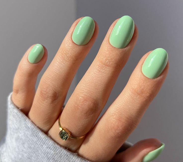 A classic mint green manicure with a glossy finish creates a clean and effortless spring style. The look is minimal, polished, and easy to wear for everyday elegance.