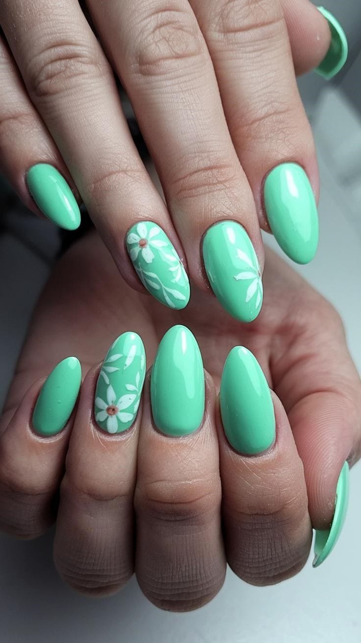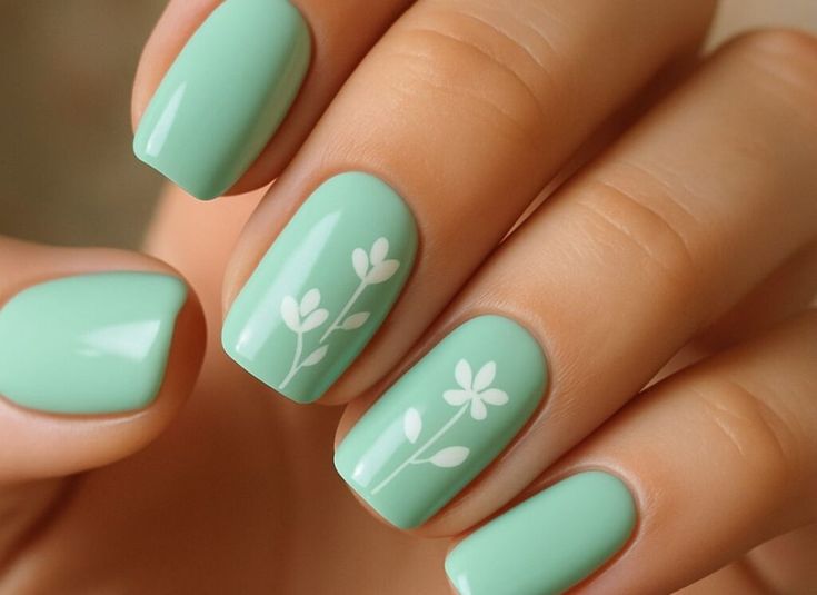 Clean mint green nails are elevated with subtle floral details for a crisp, natural spring style. The look feels calm, fresh, and inspired by outdoor blooms.