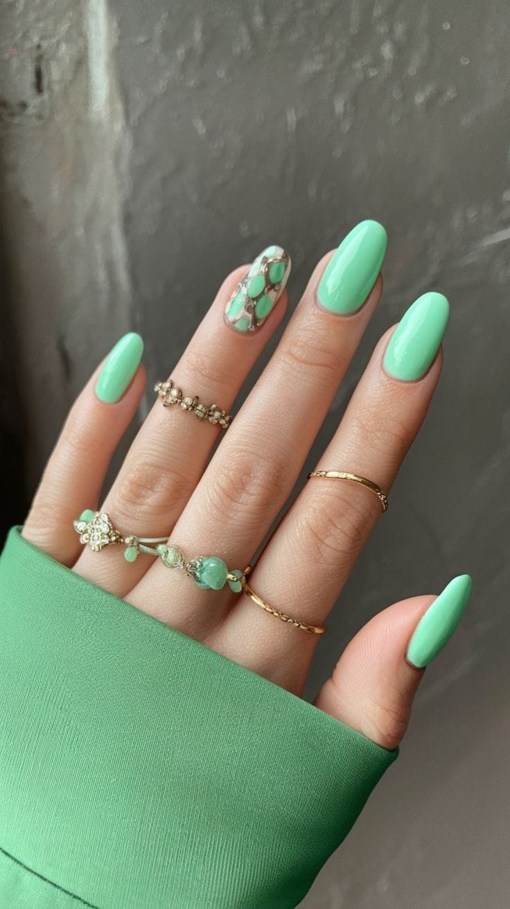 Bright mint nails are mixed with a statement accent featuring stone-like textures and soft green tones. The overall style feels polished, trendy, and slightly luxe.