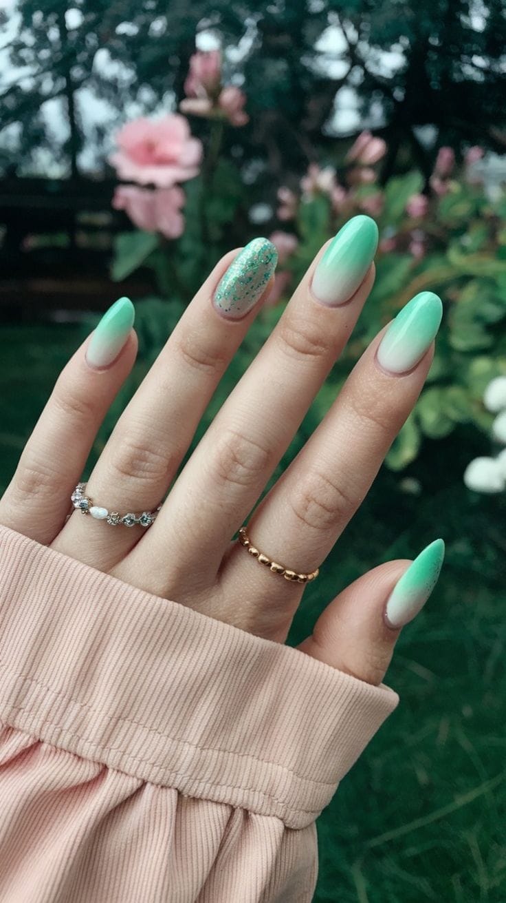 Mint green ombré nails blend softly into a natural base, with a subtle glitter accent adding a hint of sparkle. The overall vibe is airy, romantic, and inspired by blooming spring gardens.