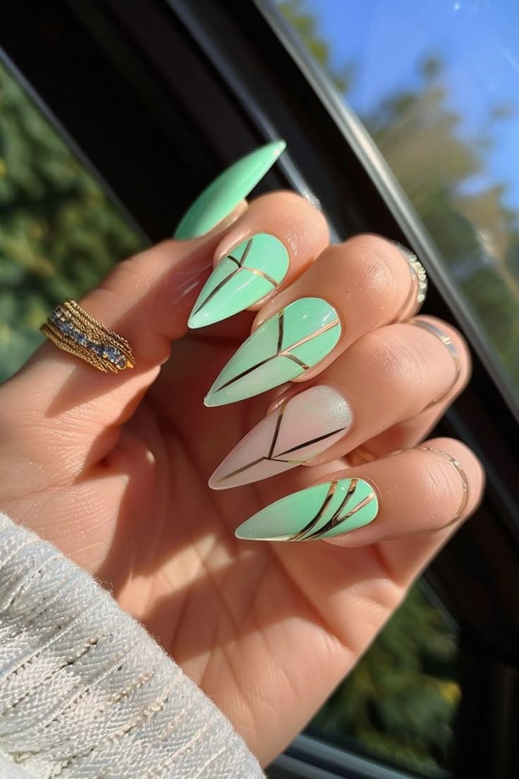 These mint green nails are elevated with sleek geometric lines and a glossy finish. The look feels modern and polished while still keeping a soft spring color palette.