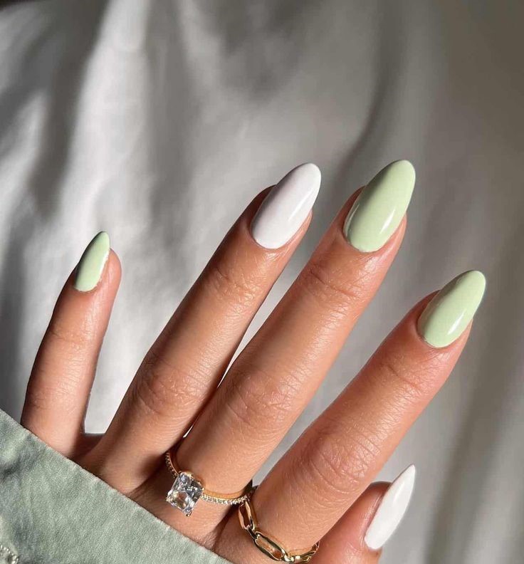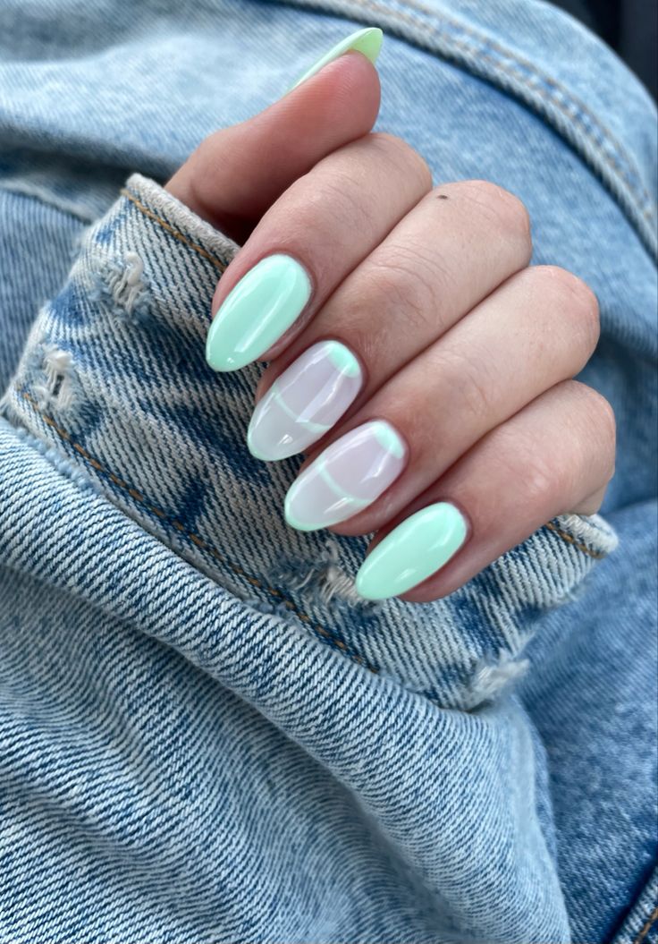 A mix of mint green and crisp white polish creates a clean, minimalist spring manicure. The almond shape and glossy finish give it a fresh, effortlessly chic vibe.
