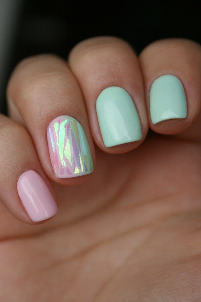 Soft mint green nails are paired with blush pink accents and a subtle iridescent geometric design. The look feels light, playful, and modern with a delicate spring shimmer.