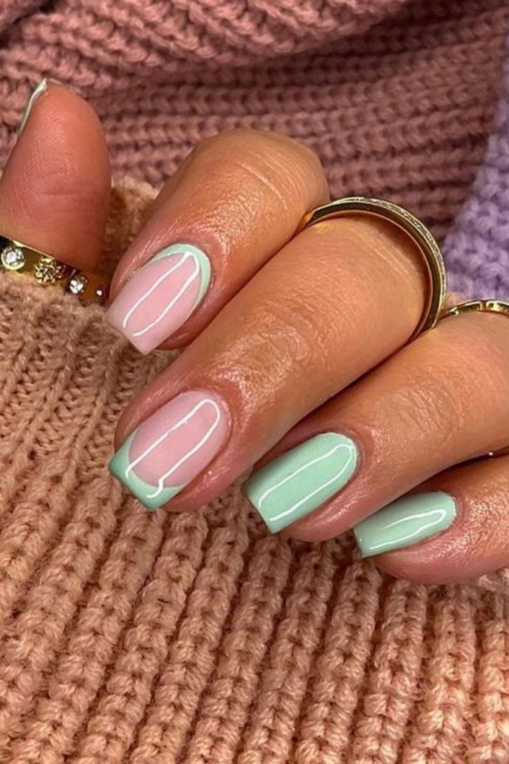 Mint green and pale pink nails are accented with thin gold detailing for a refined, feminine look. The overall style is polished, airy, and subtly luxurious.