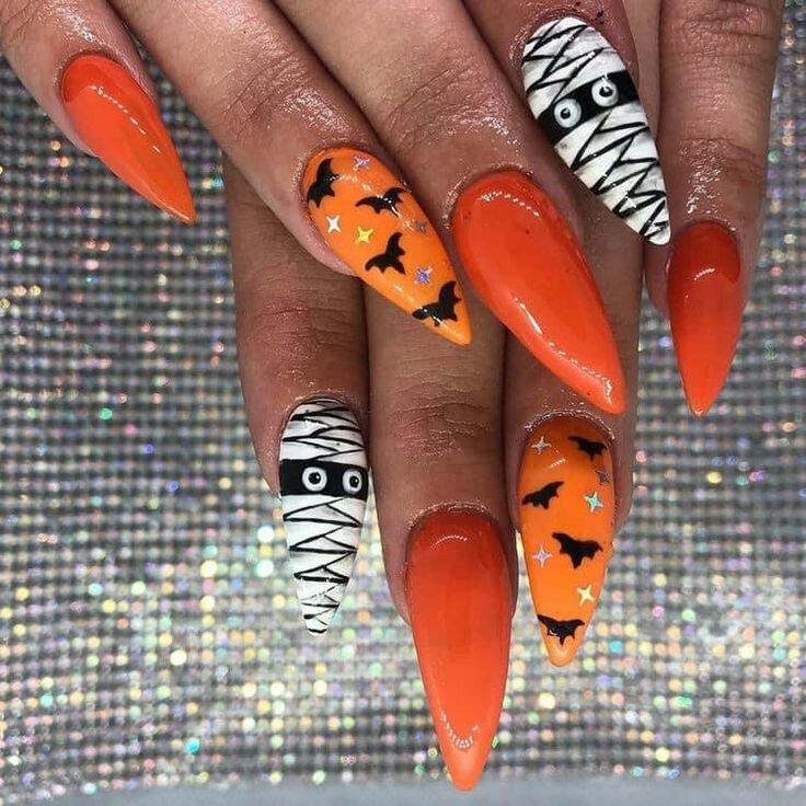 Bright orange nails paired with black bats and wrapped mummy accents for a bold, festive Halloween statement.