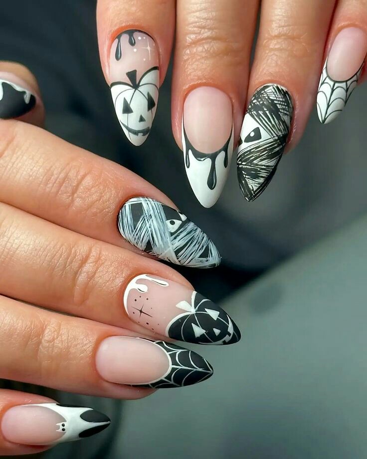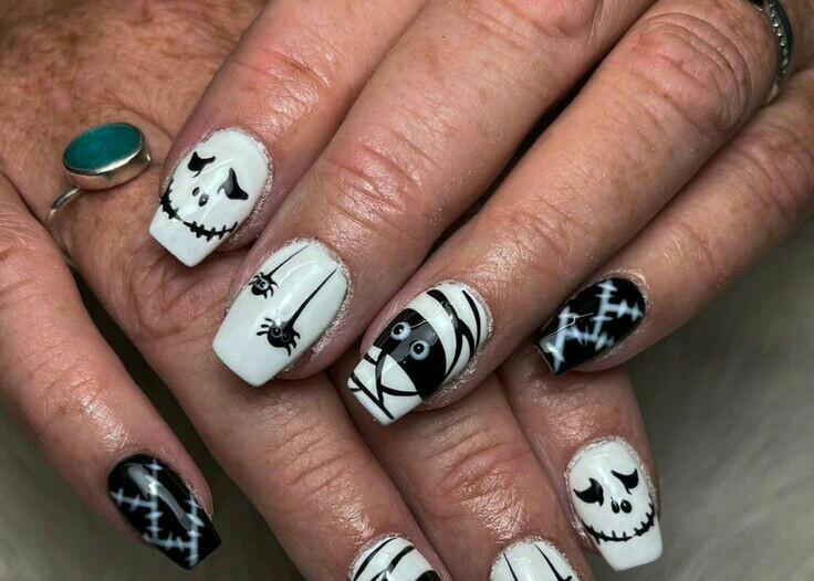 Black and white designs with sharp details like dripping paint, pumpkins, webs, and mummy wraps make a sleek and spooky statement.