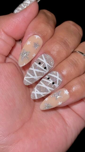 Sparkly silver nails wrapped in white bandage lines with tiny black eyes, paired with star accents for a glam twist.