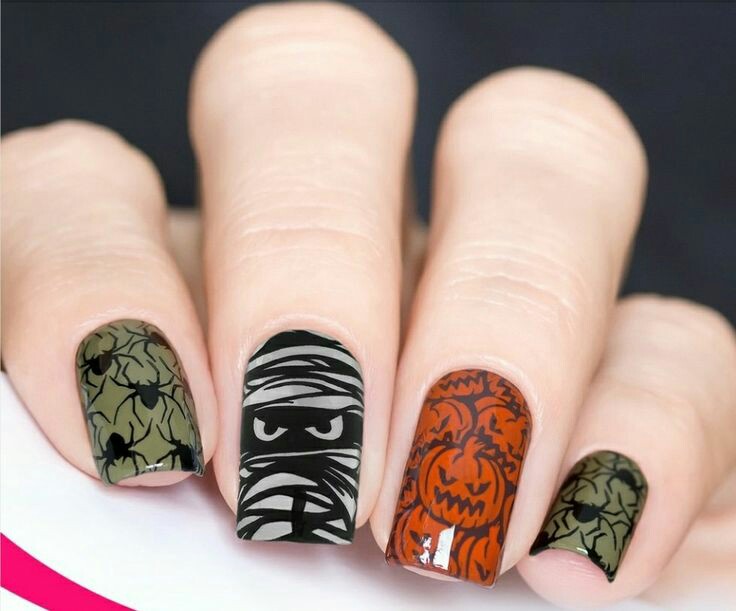Bold and edgy nails featuring a fierce black mummy face with piercing eyes, surrounded by eerie green bats and orange pumpkins.