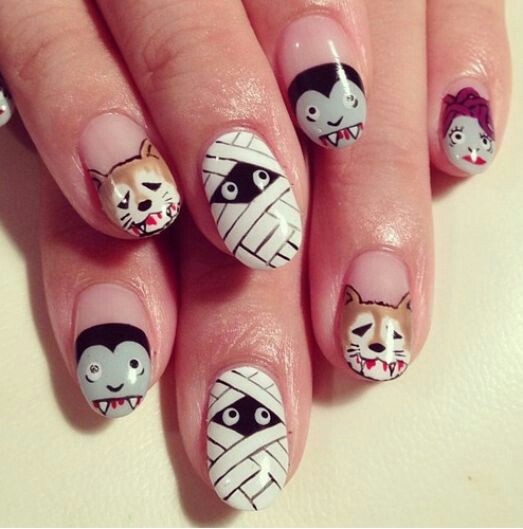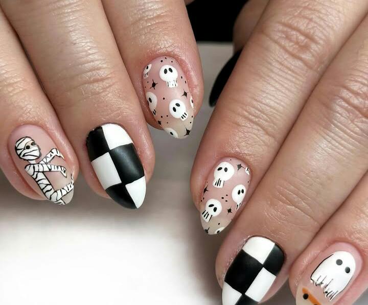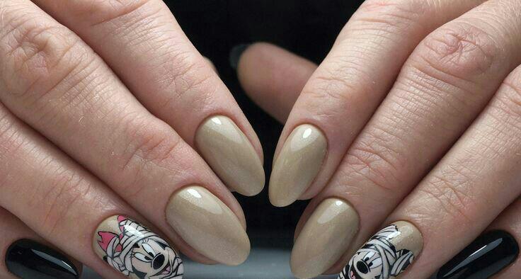 Neutral beige nails get a fun pop with cute cartoon mummy designs, blending spooky with playful charm.