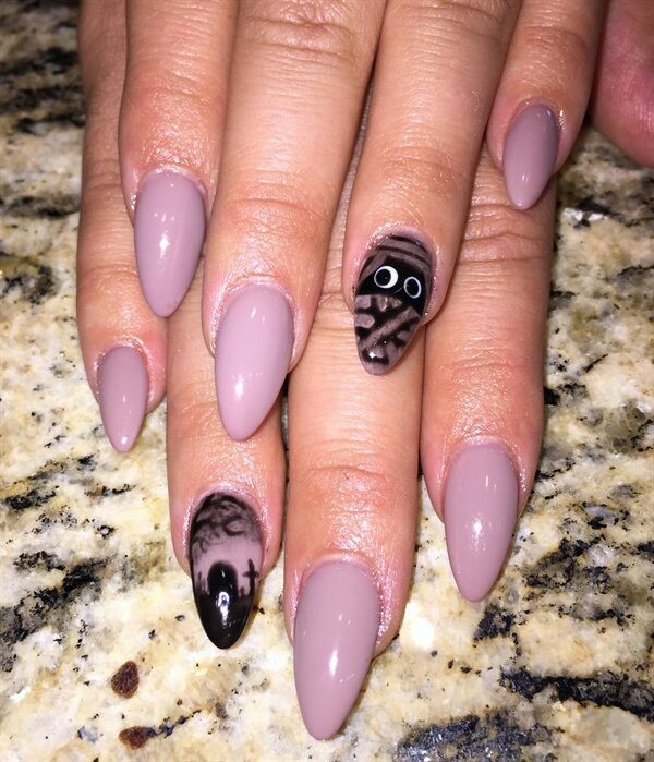 Neutral mauve nails with accent art featuring a shadowy graveyard and a wrapped mummy peeking out, creating a subtle yet eerie vibe.