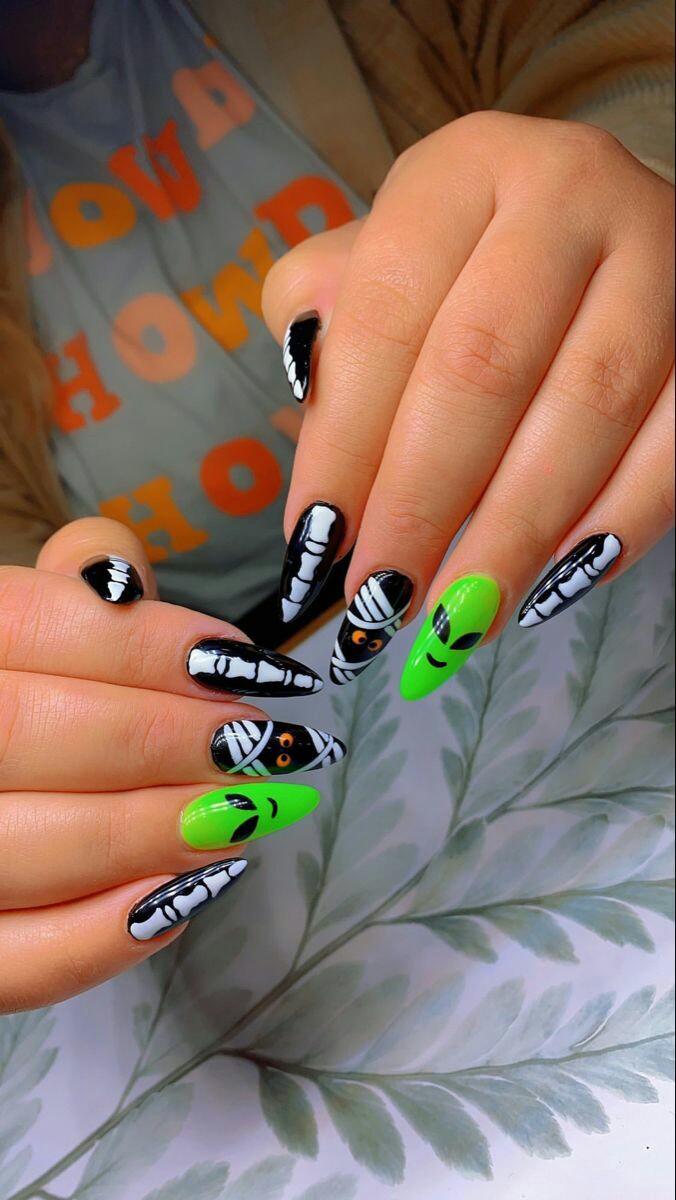 Bold black and neon green nails decorated with glowing aliens, skeleton bones, and wide-eyed mummies for a fun, spooky mashup.