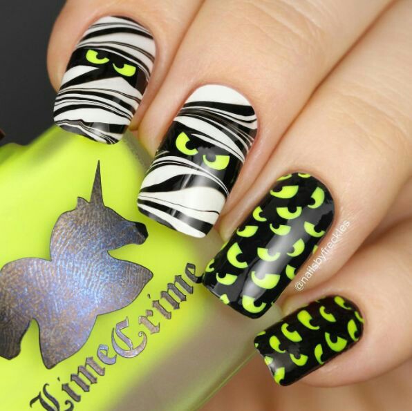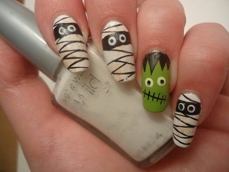 White nails wrapped in black mummy lines with peeking eyes, paired with a green Frankenstein accent for a playful Halloween look.