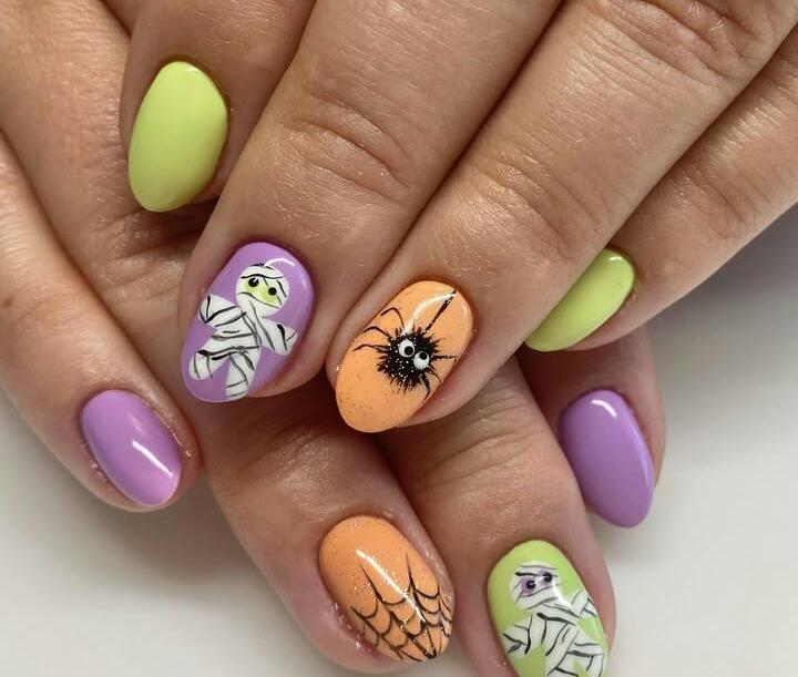 Bright pastel nails in purple, orange, and green with cartoon mummies, webs, and a quirky spider design for a cheerful Halloween twist.
