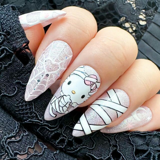 Soft pastel pink and glittery nails paired with a Hello Kitty mummy design and web patterns, giving a sweet and playful Halloween look.