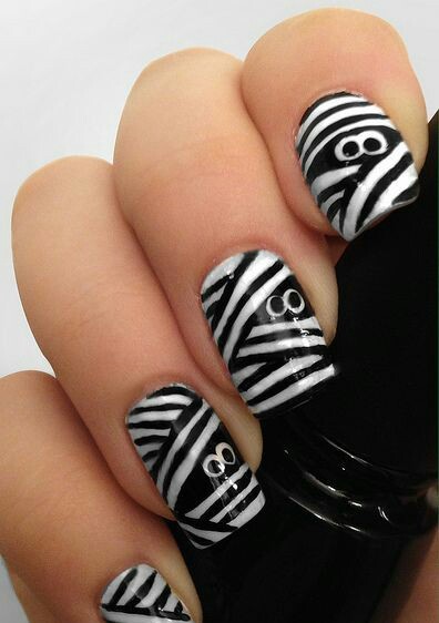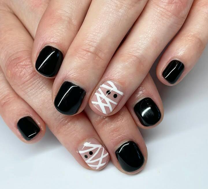 Simple yet striking black nails with white wrap stripes and peeking eyes for a timeless mummy effect.