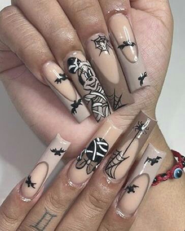 Long nude french nails decorated with black mummy wrapped minnie, spiderwebs, and bats for a dark, gothic-inspired style.