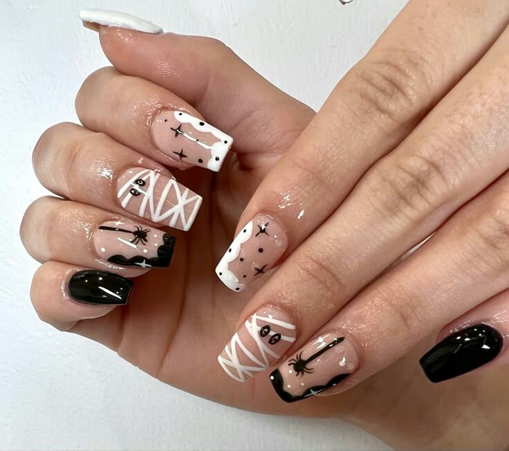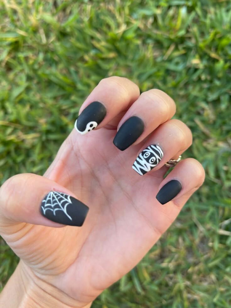 Matte black nails with crisp white mummy, ghost, and spiderweb accents deliver a dark yet stylish Halloween aesthetic.