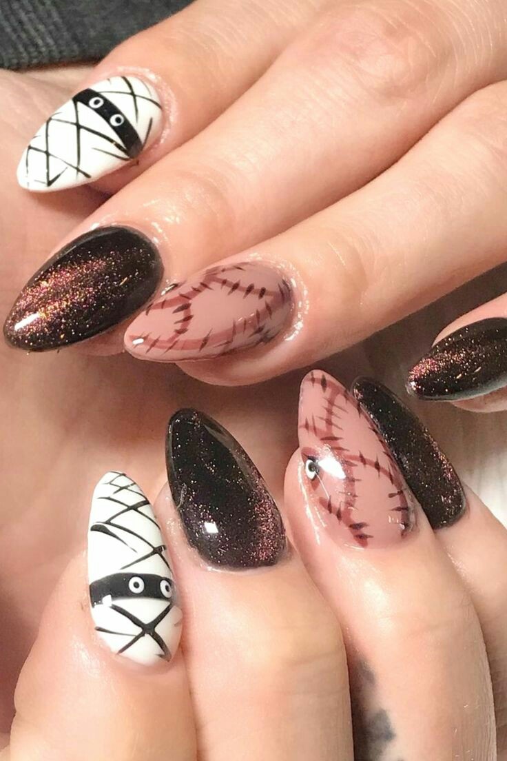 Dark glitter nails pair with stitched patterns and peeking mummy eyes for a glam yet creepy effect.