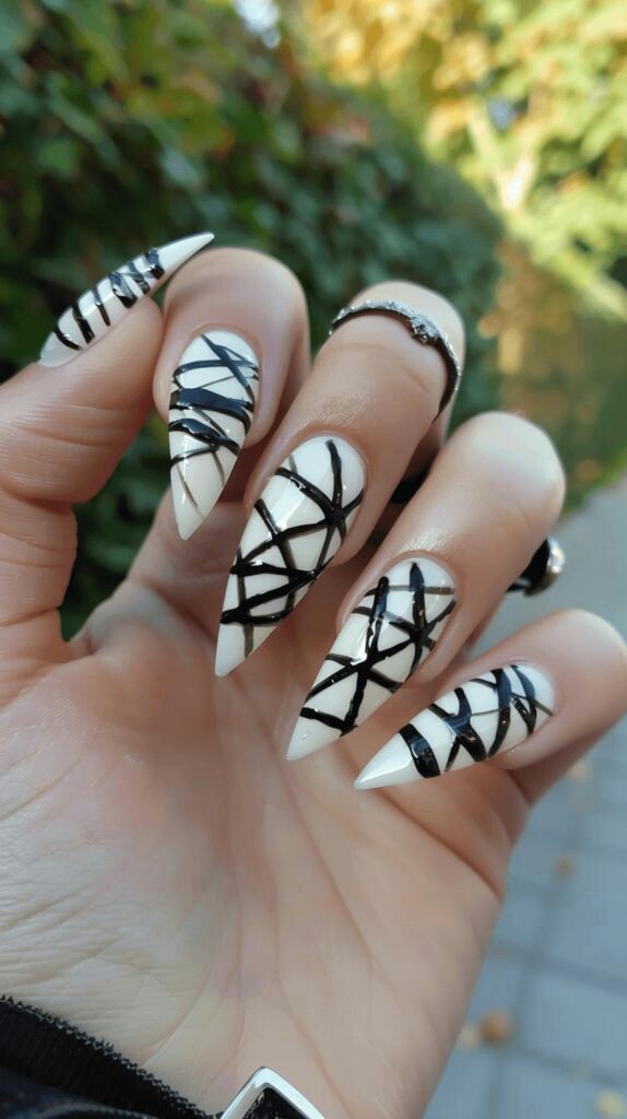Sharp stiletto nails with bold black crisscross lines over a white base create a dramatic wrapped look.