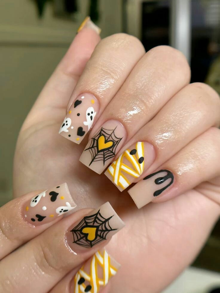 Square nails with nude bases decorated in ghosts, spiderwebs and yellow mummy-inspired wraps, creating a colorful, festive theme.