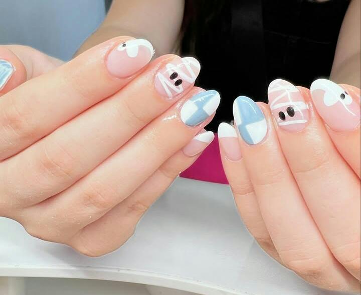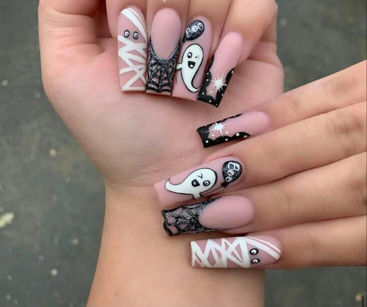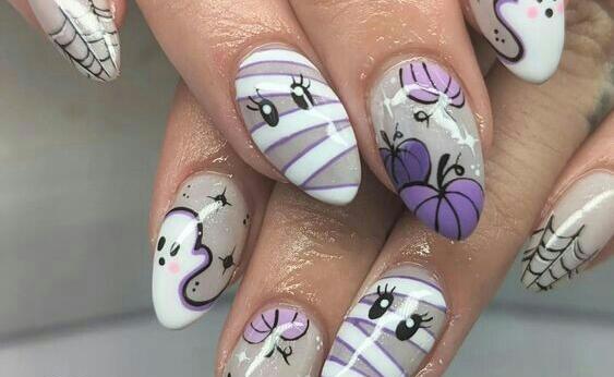 Soft pink nails with a mix of mummy wraps, spiderwebs, and ghost accents create a fun and playful Halloween look.