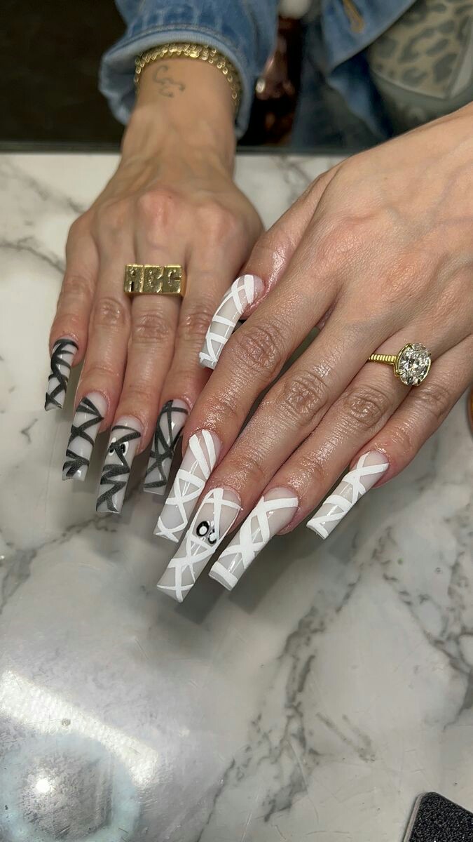 Long coffin nails wrapped in bold white and black crisscross lines with peeking eyes, creating a striking, modern mummy-inspired statement.