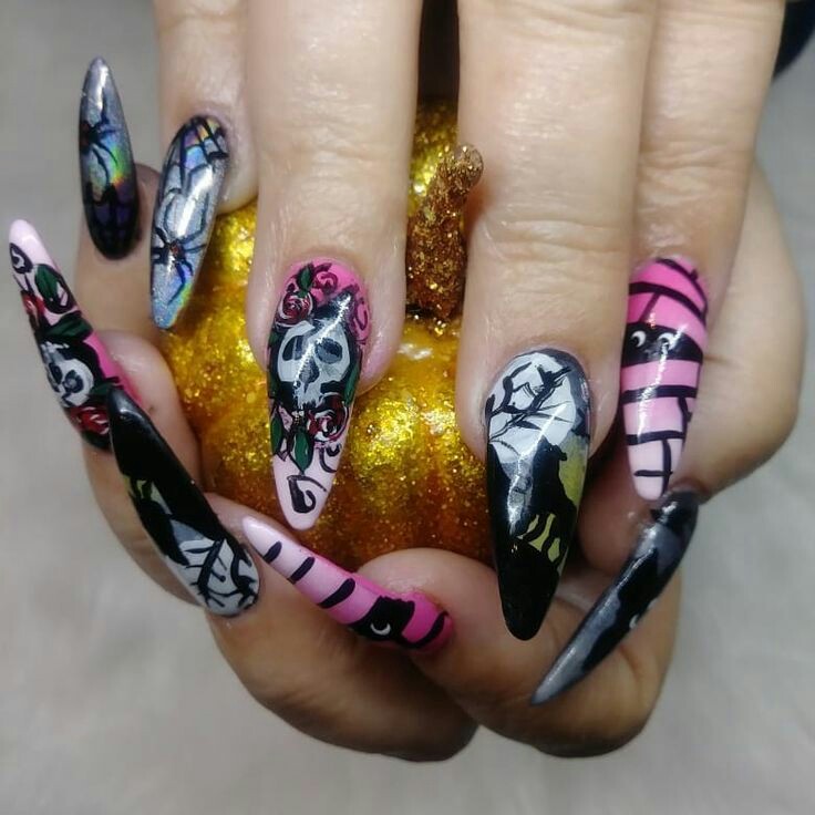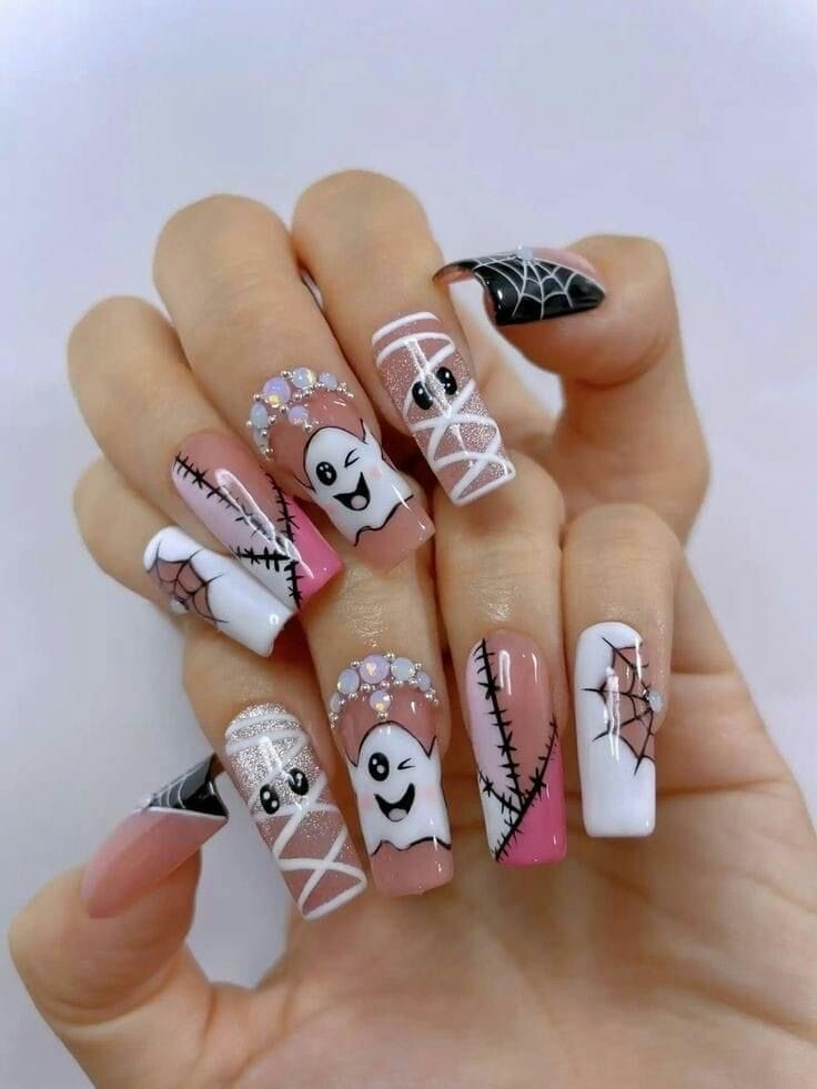 Playful designs featuring ghosts, stitches, webs, and sparkly mummy wraps on a pink base with a touch of glam.