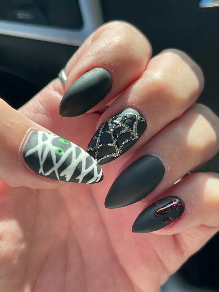 A bold matte black base with accent nails featuring white wrappings, glittery spiderwebs, and blood-red drips for a dark Halloween vibe.