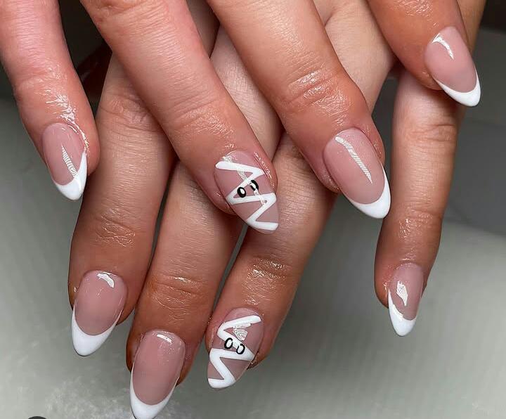 A classy nude French manicure with a fun twist, adding simple white wrap lines and tiny black eyes for a playful mummy effect.