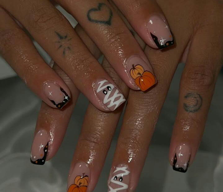 Neutral-toned nails with black tips, pumpkins, and wrapped mummy accents with tiny eyes, blending creepy and cute perfectly.