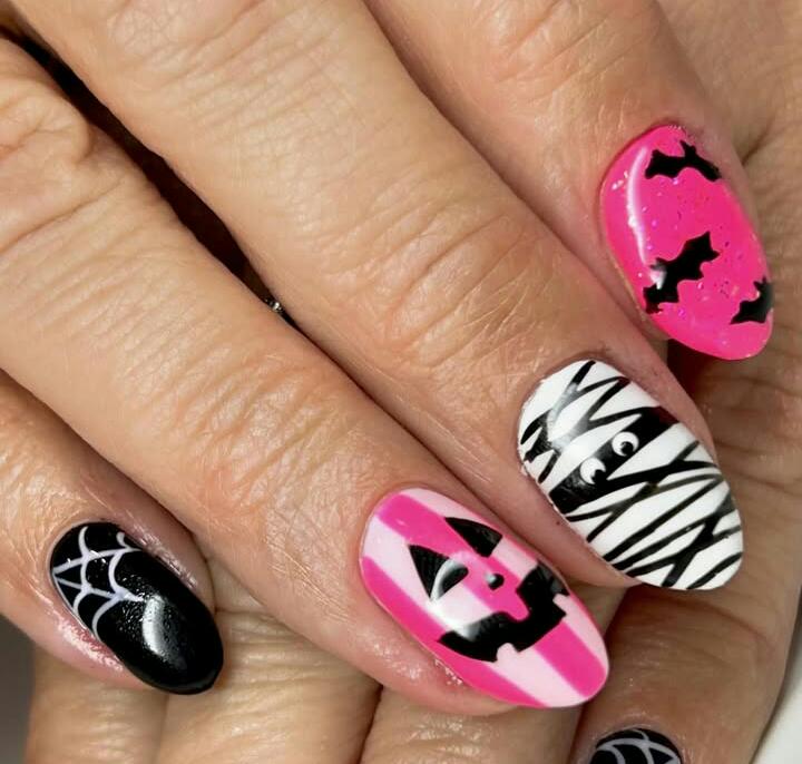 A bold mix of hot pink, black, and white with mummy stripes, bats, and webs gives a vibrant and edgy vibe.