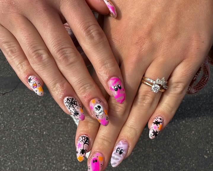 A mix of mummies, ghosts, and spiderweb accents on pink nails, giving a playful haunted vibe.