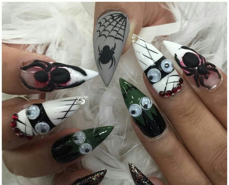 A bold Halloween mix with 3D googly eyes, spider webs, and black-and-white mummy wraps for a spooky, statement look.