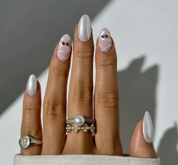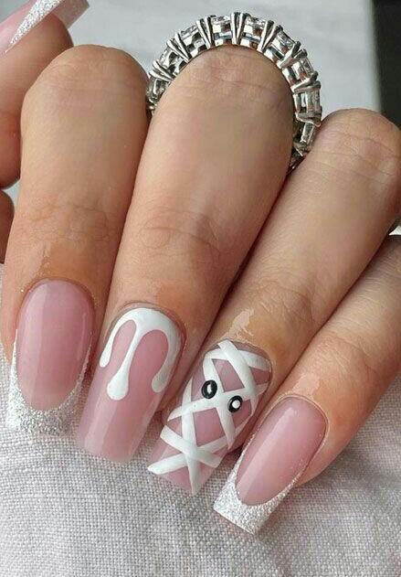 A nude base with subtle white drips and a cute mummy wrap accent, creating a soft yet spooky Halloween look.
