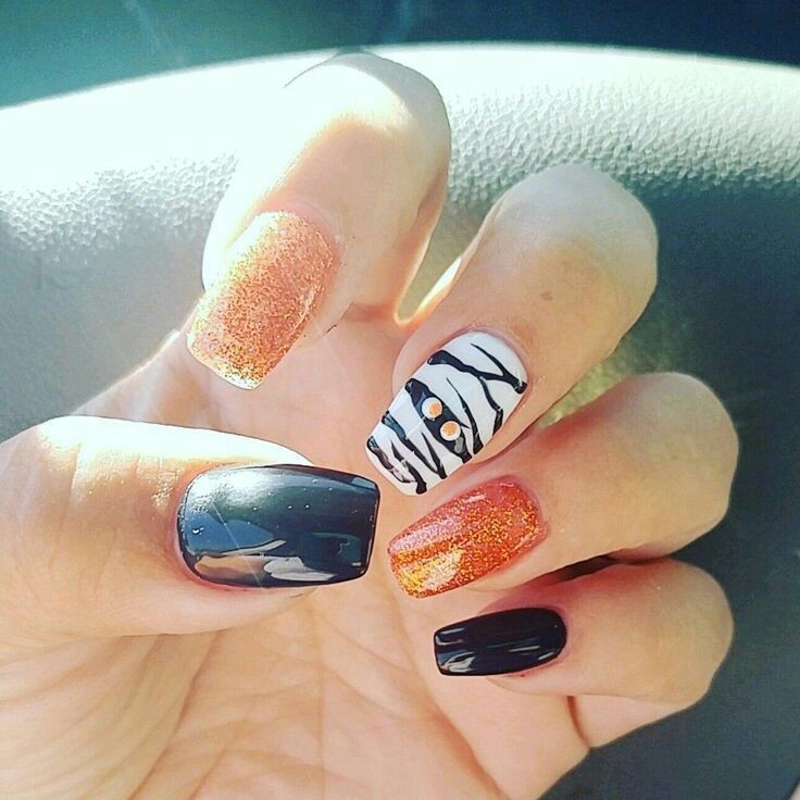 A bold combo of orange glitter, shiny black, and a white mummy nail with glowing eyes, striking the perfect balance of spooky and glam.