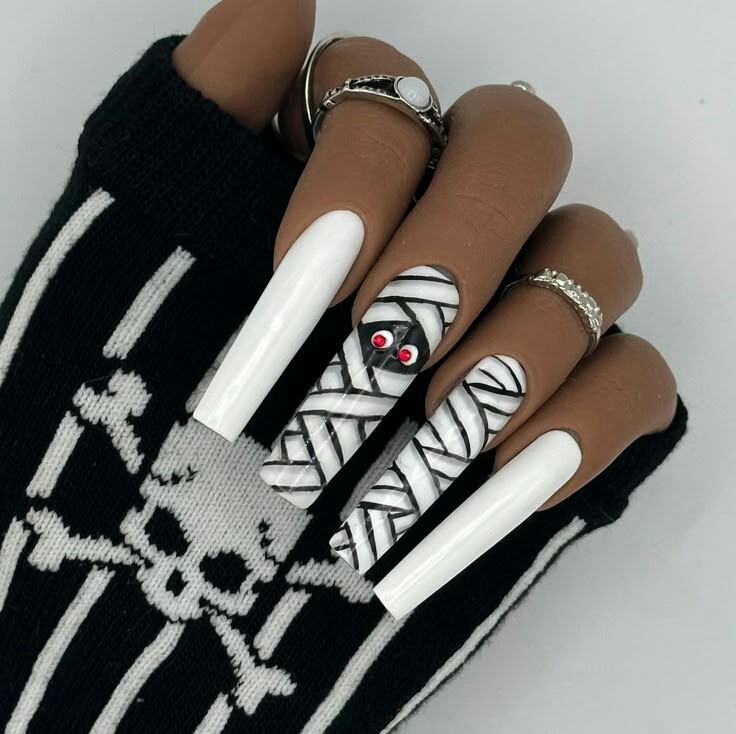 Bold coffin nails in white and black mummy wraps with glowing red eyes, paired with sleek solid white nails.