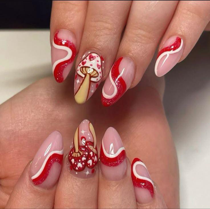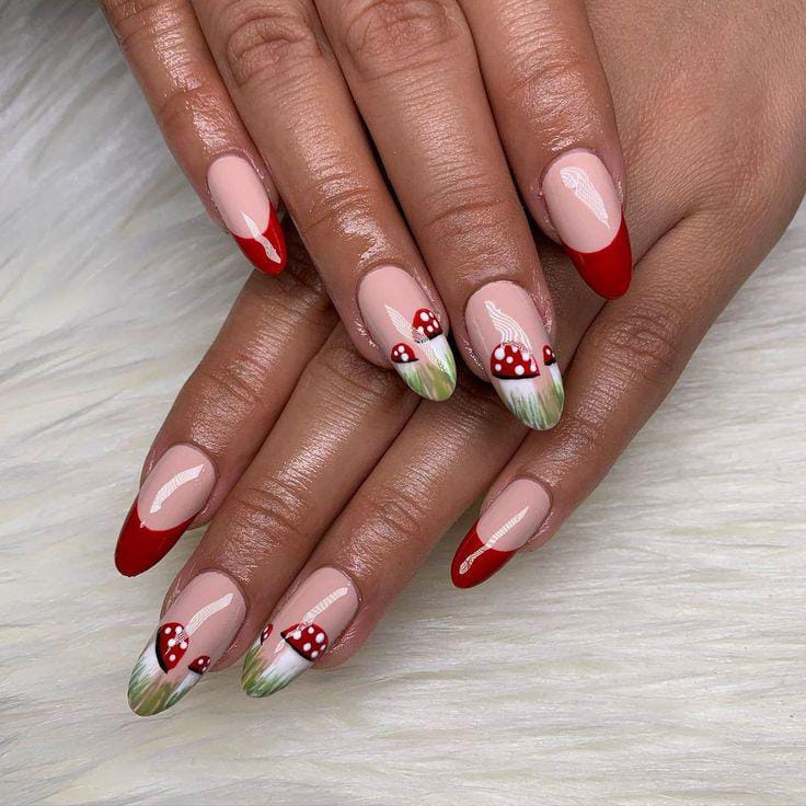 Classic nude and red French tips are elevated with tiny mushrooms and grassy details, bringing a fresh woodland charm.