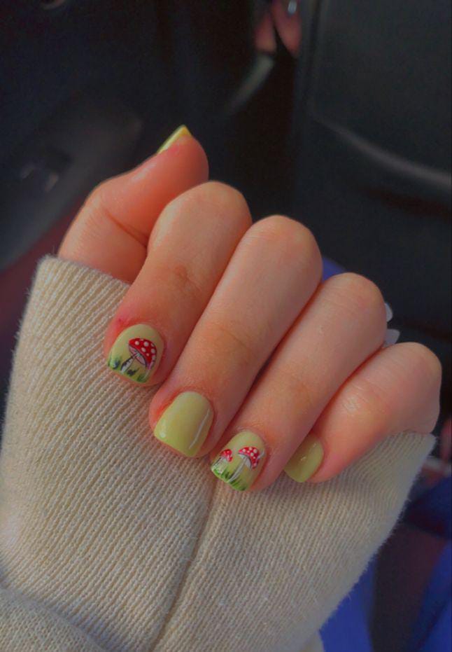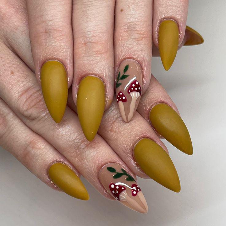 Earthy mustard matte nails paired with delicate mushroom accents give this set a cozy, forest-inspired look.
