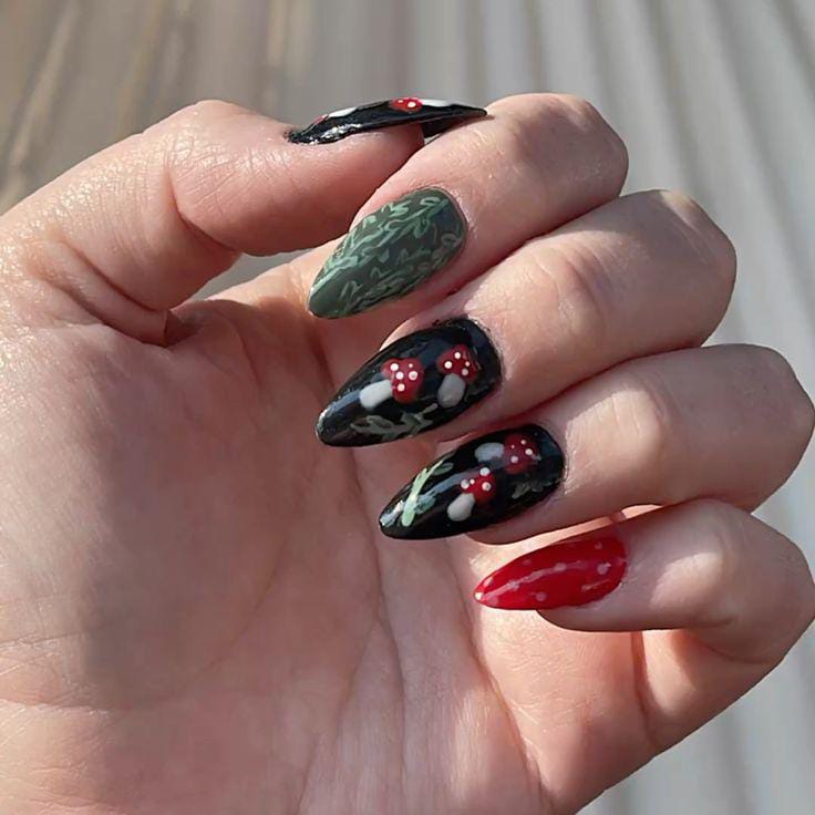 Deep black and green nails with bright red mushrooms create a moody, enchanted forest effect with a mystical edge.