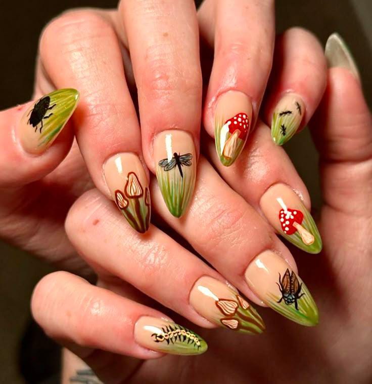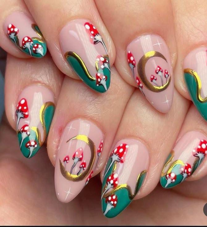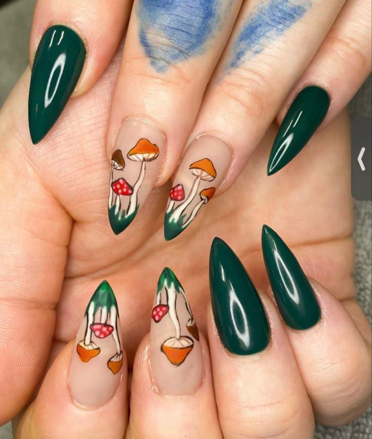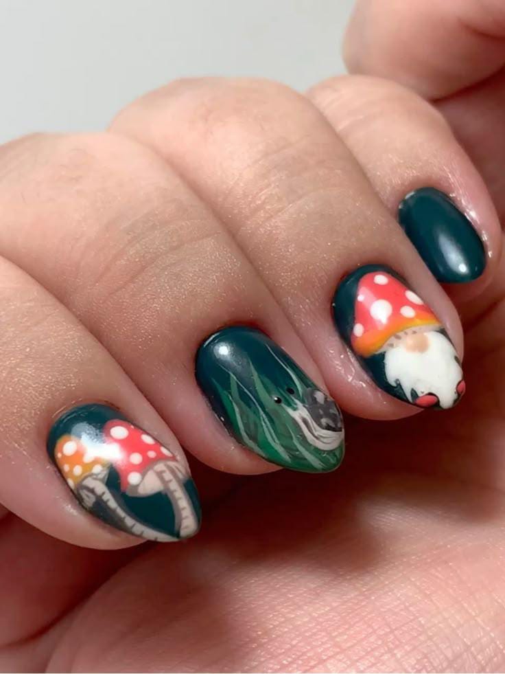 Rich green nails paired with detailed mushroom art in orange and red shades make this set feel magical and nature-inspired.